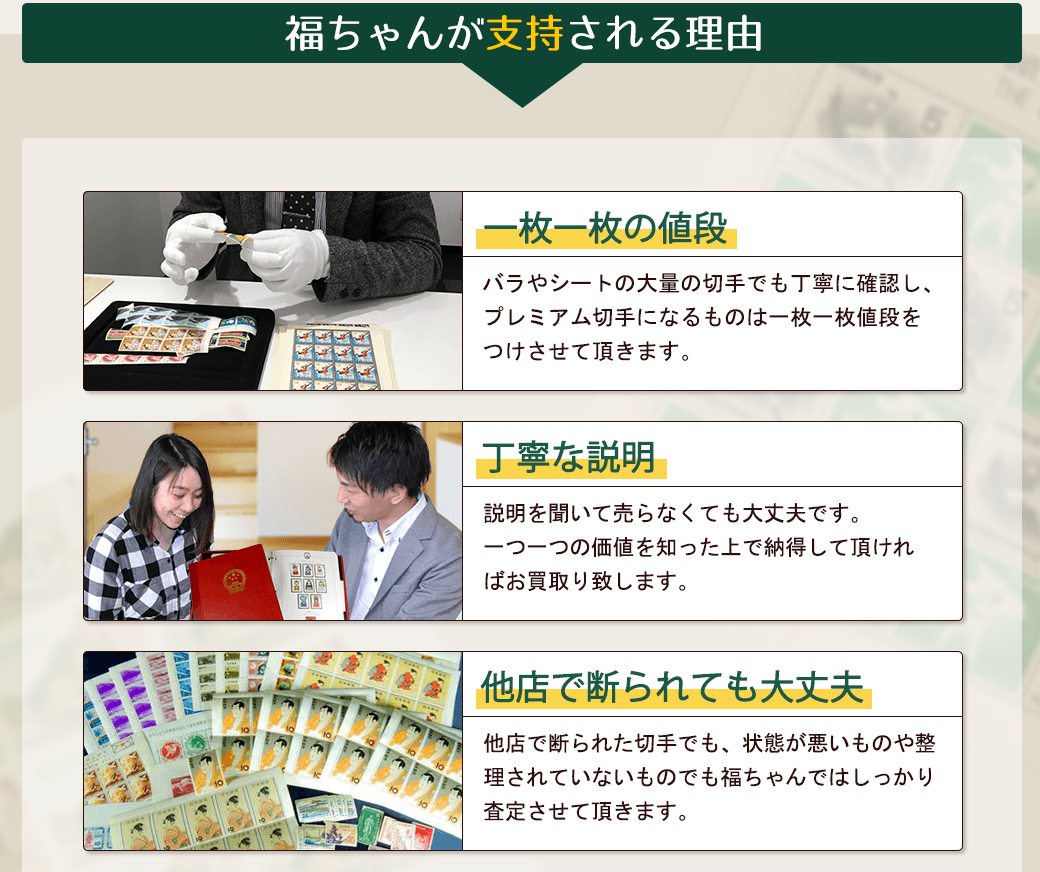 福ちゃんでは、「切手をどこよりも高く買取る自信があります。」をキャッチコピーとして買取がはじめての方も安心して利用できるサービスを心掛けています。