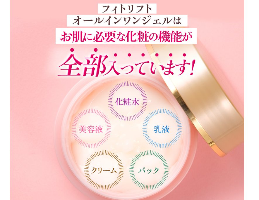 フィトリフト オールインワンジェルは、化粧水・乳液・美容液・クリーム・パックの5つの機能が可能となった、高品質オールインワンジェルです。